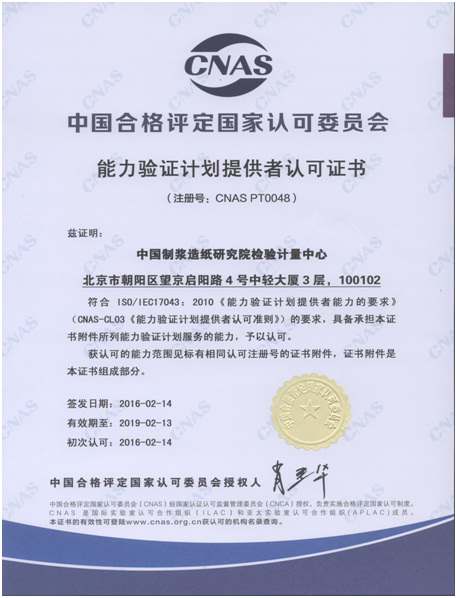 2016年,國家紙張質(zhì)量監(jiān)督檢驗中心(質(zhì)檢中心)迎來了實驗室認(rèn)可的開門紅,于2月14日,獲得了中國合格評定國家認(rèn)可委員會(CNAS)頒發(fā)的能力驗證提供者認(rèn)可證書,成為了首家通過CNAS認(rèn)可的紙張行業(yè)的能力驗證提供者,取得了獨立組織CNAS承認(rèn)的能力驗證活動的資格。該項證書的獲得,標(biāo)志著質(zhì)檢中心實驗室建設(shè)水平邁上了一個新臺階,同時也將對紙及紙制品檢測行業(yè)發(fā)展提供更為有力的技術(shù)支撐。