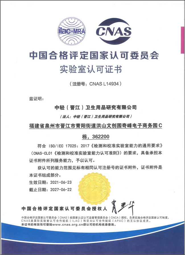 6月23日,中輕(晉江)衛(wèi)生用品研究有限公司順利通過中國合格評定國家認(rèn)可委員會(簡稱“CNAS”)的首次評審,成功獲得CNAS實(shí)驗(yàn)室認(rèn)可證書。
