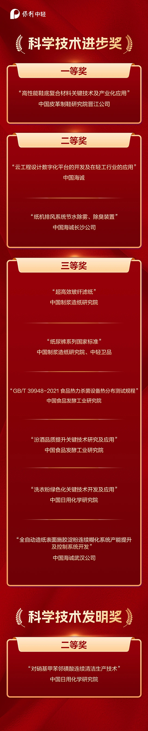 近日,“2024年中國(guó)輕工業(yè)聯(lián)合會(huì)科學(xué)技術(shù)獎(jiǎng)”評(píng)選結(jié)果正式揭曉。保利中輕榮獲中國(guó)輕工業(yè)聯(lián)合會(huì)科學(xué)技術(shù)進(jìn)步獎(jiǎng)一等獎(jiǎng)1項(xiàng)、二等獎(jiǎng)2項(xiàng)、三等獎(jiǎng)6項(xiàng),科學(xué)技術(shù)發(fā)明獎(jiǎng)二等獎(jiǎng)1項(xiàng)。