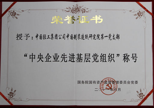 中國(guó)輕工集團(tuán)公司中國(guó)制漿造紙研究院第一黨支部七一前夕榮獲國(guó)資委“中央企業(yè)先進(jìn)基層黨組織”榮譽(yù)稱號(hào)。