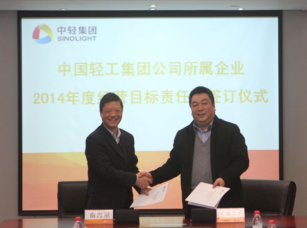 集團(tuán)公司總經(jīng)理俞海星在儀式上代表集團(tuán)公司與所屬11家二級(jí)企業(yè)主要負(fù)責(zé)人簽訂了2014年度經(jīng)營(yíng)目標(biāo)責(zé)任書。